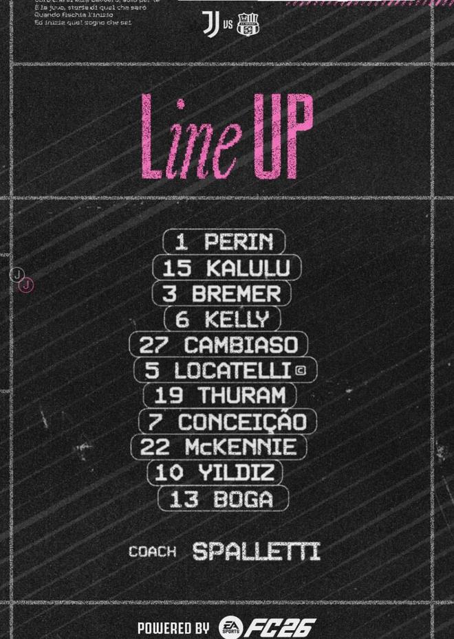 尤文首发:1-佩林、27-坎比亚索、15-卡卢卢、6-凯利、3-布雷默、19-图拉姆、22-麦肯尼、5-洛卡特利、7-孔塞桑、10-伊尔迪兹、13-博加
